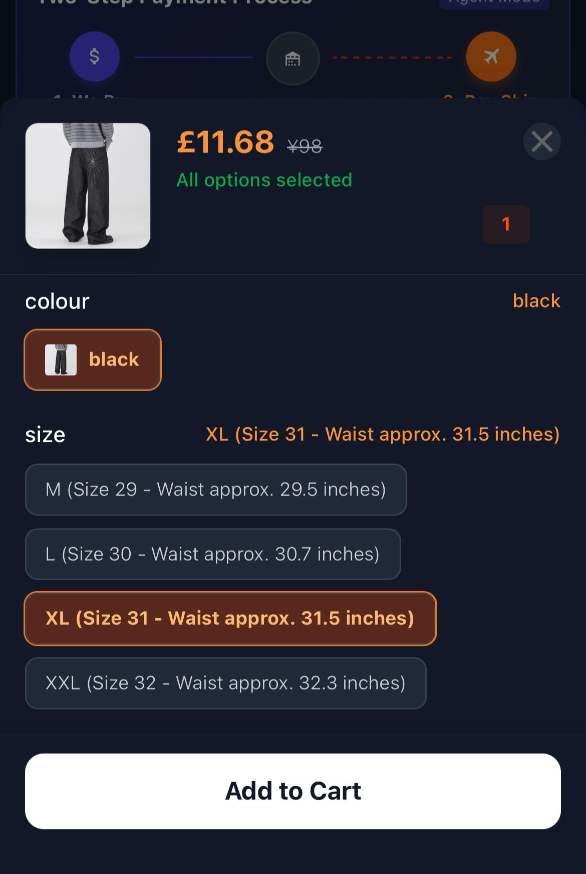 Step 3 — Select Options & Add to CartOnce the product loads, you’ll see:>price (you can set your home currency in you agent account settings)